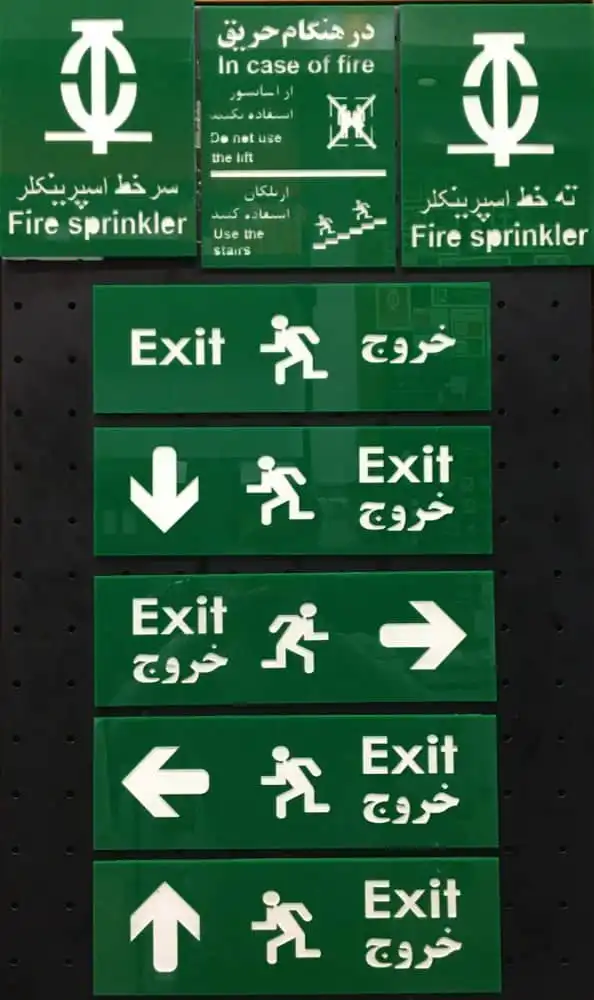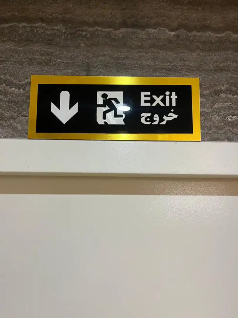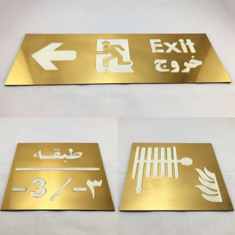 تابلوهای خروج با جهتهای مختلف فلش (راست، چپ، بالا، پایین) به همراه متن فارسی و انگلیسی طراحی شدهاند و قابلیت ساخت بهصورت LEDدار، پلکسی یا چاپی را دارند. همچنین، تابلوهای طبقات (مثلاً «طبقه همکف» یا «طبقه -۳») به صورت دو زبانه با قاب دلخواه (طلایی، نقرهای یا مشکی) تولید میشوند.